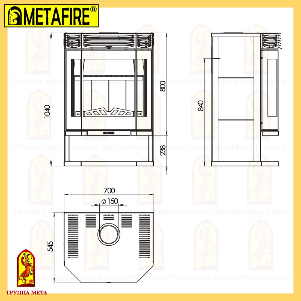 Размеры печи камина: высота - 1040 мм, ширина - 700 мм, глубина - 545 мм.