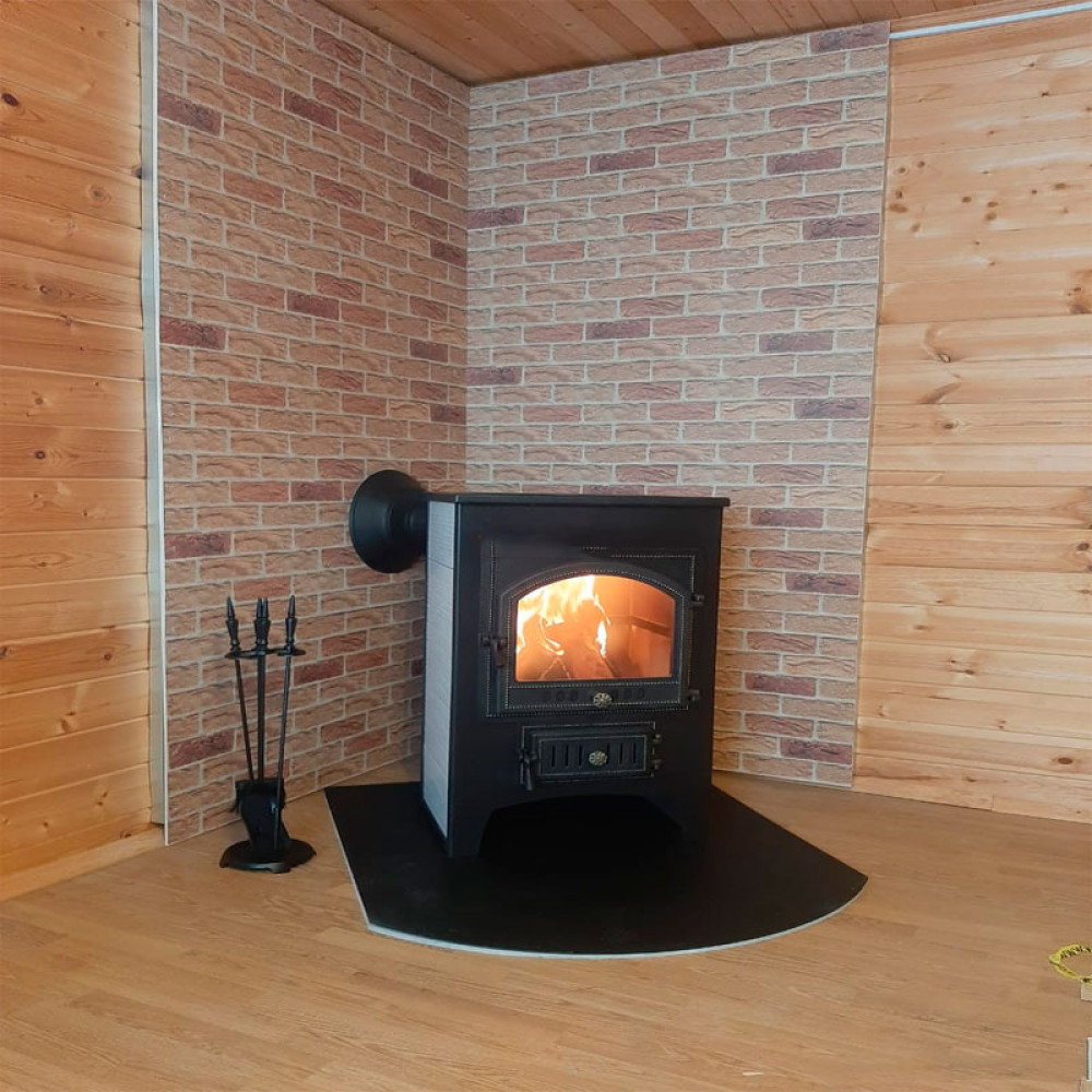 Корпус печи камина выполнен из стали и облицован декоративной керамикой. Стальные печи быстро прогревают воздух в помещении. Начинают давать тепло уже через 15 минут после растопки. Дверца печи камина декорирована стеклом. Такие стекла делаются всего в 2 странах: Германии и Японии. Оно выдерживает температуру до 750 градусов. Но если ударить кочергой, то может треснуть. Через стекло вы любуетесь огнем, следите за прогоранием дров и подкладкой новых. В этой печи использовано прямое остекление.