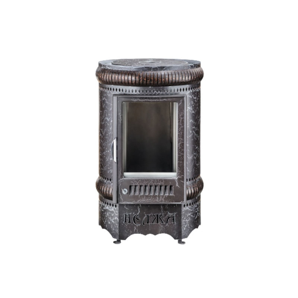 Дверца топки снабжена термостойким керамическим стеклом, которое не лопается при нагреве и температурных перепадах. Через технологические отверстия на дверце в топку подается воздух. Воздушные потоки постоянно циркулируют вдоль дверцы, создавая барьер для оседания копоти. Стекло всегда остается чистым, поэтому в комнате печь «Нелжа» может заменять классический камин. Благодаря цилиндрическому корпусу оборудование хорошо вписывается даже в компактные помещения нестандартной формы.