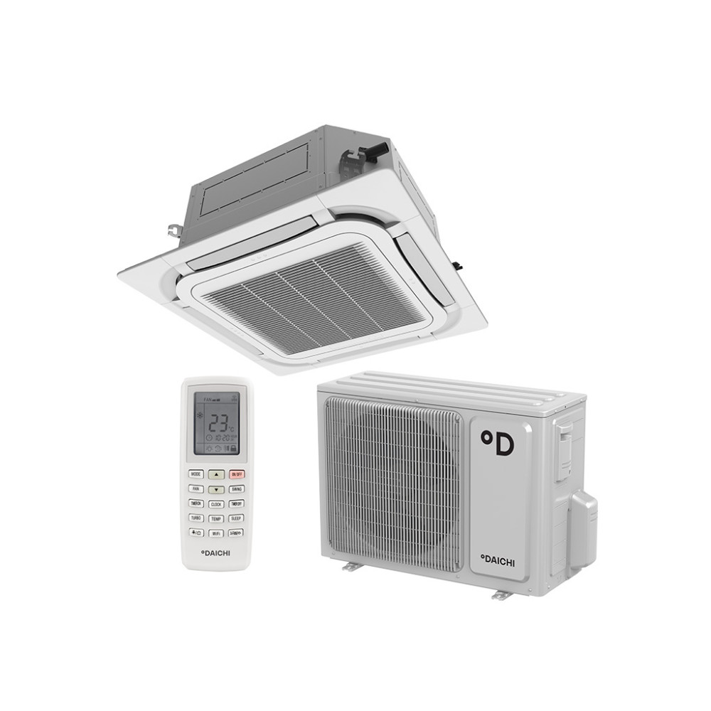 Кассетный кондиционер Daichi (Дайчи) DA35ALFS1R/DF35ALS1R/DPT05L подходит для офисных помещений небольшой площади, монтируется в стандартную ячейку подвесного потолка. Кондиционер обеспечивает равномерное распределение воздушного потока по всему помещению, славится низким энергопотреблением и работает практически бесшумно.