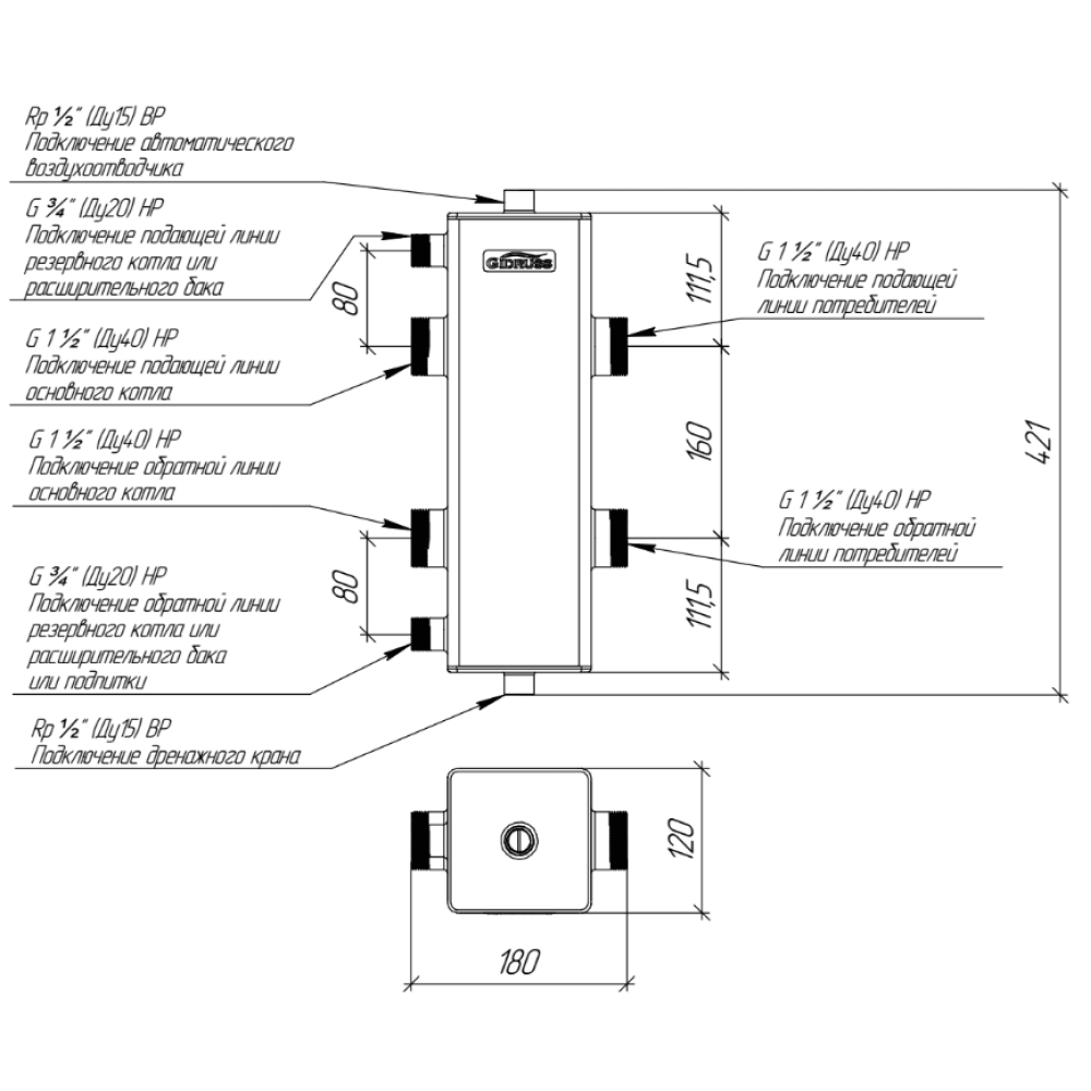 Гидрострелка Gidruss GRSS-150-40 до 150 кВт 1 1/2" нержавеющая сталь