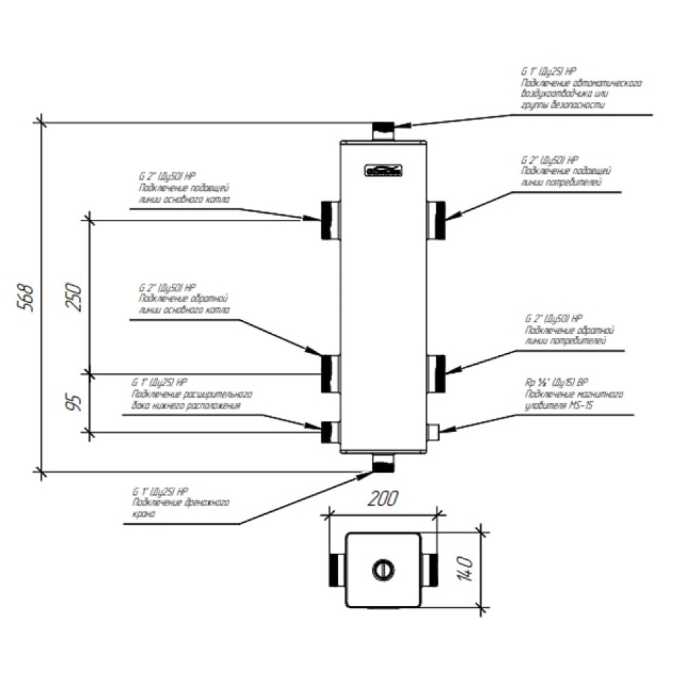 Гидрострелка GR-250-50 необходима в системах отопления до 2000 м² для обвязки каскада настенных котлов до 250 кВт или напольных до 200 кВт.