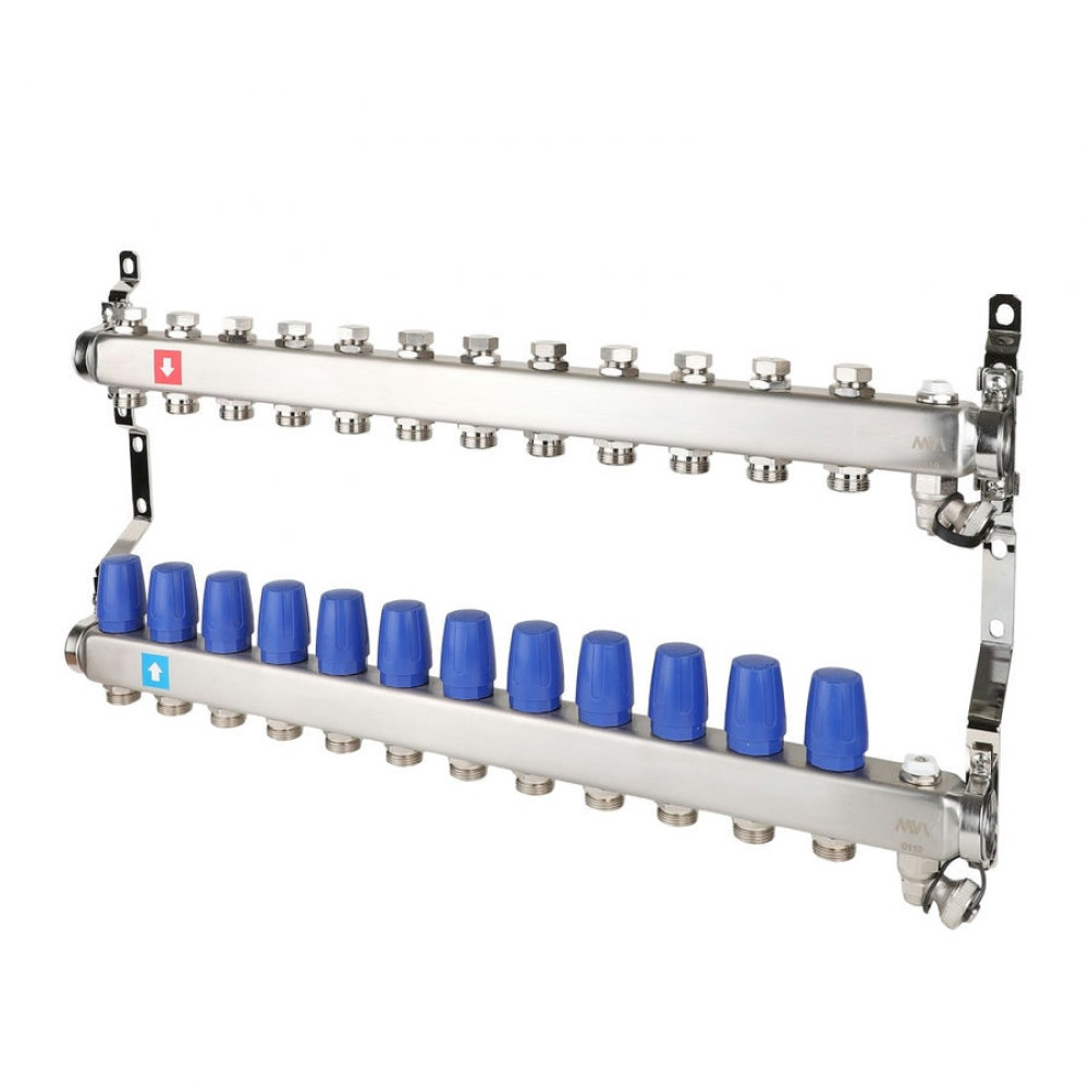 Коллекторные блоки MVI предназначены для распределения потока рабочей среды систем водяного отопления по потребителям. При этом под «потребителем» понимается отдельный нагревательный прибор или группа приборов, контур или петля «теплого пола», отдельные части или ветви системы. Коллекторный блок объединяет в себе подающий и обратный коллекторы из нержавеющей стали, запорные клапаны, термостатические клапаны (с возможностью установки электротермического сервопривода) и крепежные кронштейны. Коллекторные блоки могут работать как на водяном, так и низкозамерзающем (гликолевом) теплоносителе. Коллекторные блоки выпускаются с количеством выходов от 2 до 12. Присоединение циркуляционных петель осуществляется с помощью фитингов стандарта «евроконус» 3/4" (НР).