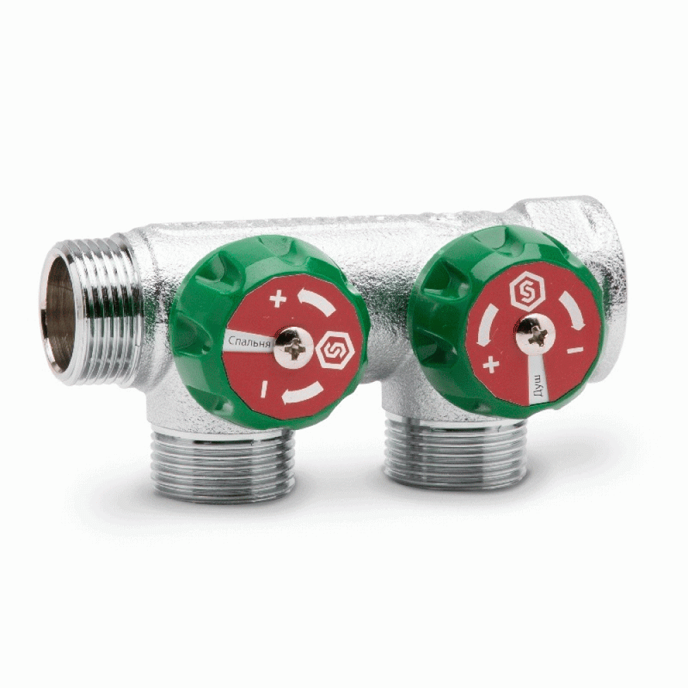 Коллектор регулирующий Stout 1"x3/4" «ЕК евроконус» с 2 отводами и запорными клапанами (SMB-6850-013402) служит для распределения потока транспортируемой среды в системах водоснабжения и отопления путём перекрытия клапанов на отводах.