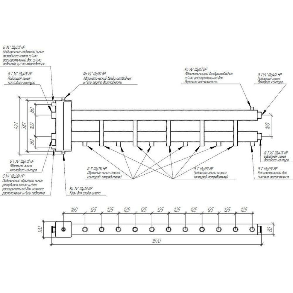 Боковой контур повышенной производительности G 1 1/2″ позволяет подключать мощные потребители, такие как теплообменники для подогрева бассейнов и вентиляции, а так же расширять кол-во потребителей при расширении хозяйства путем транзитного присоединения любого модульного коллектора серии MK-150.