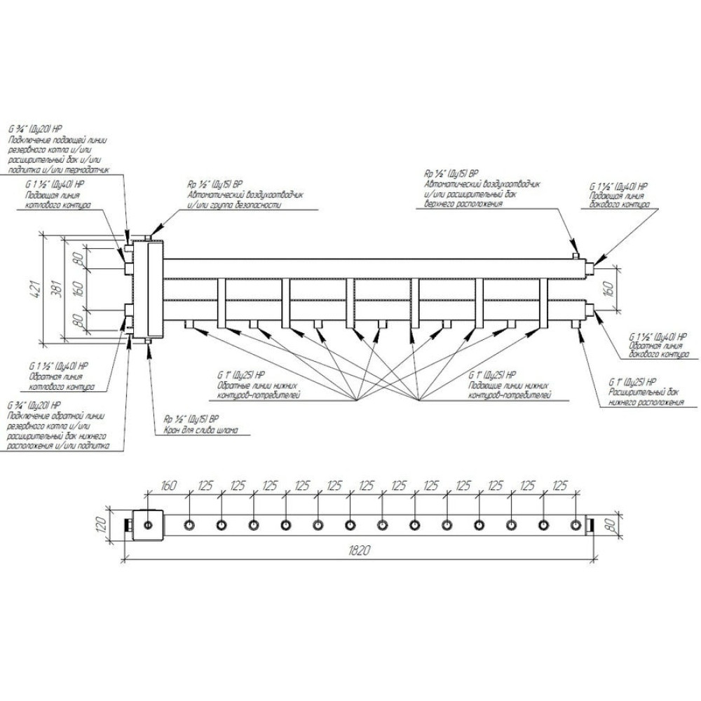 Боковой контур повышенной производительности G 1 1/2″ позволяет подключать мощные потребители, такие как теплообменники для подогрева бассейнов и вентиляции, а так же расширять кол-во потребителей при расширении хозяйства путем транзитного присоединения любого модульного коллектора серии MK-150.