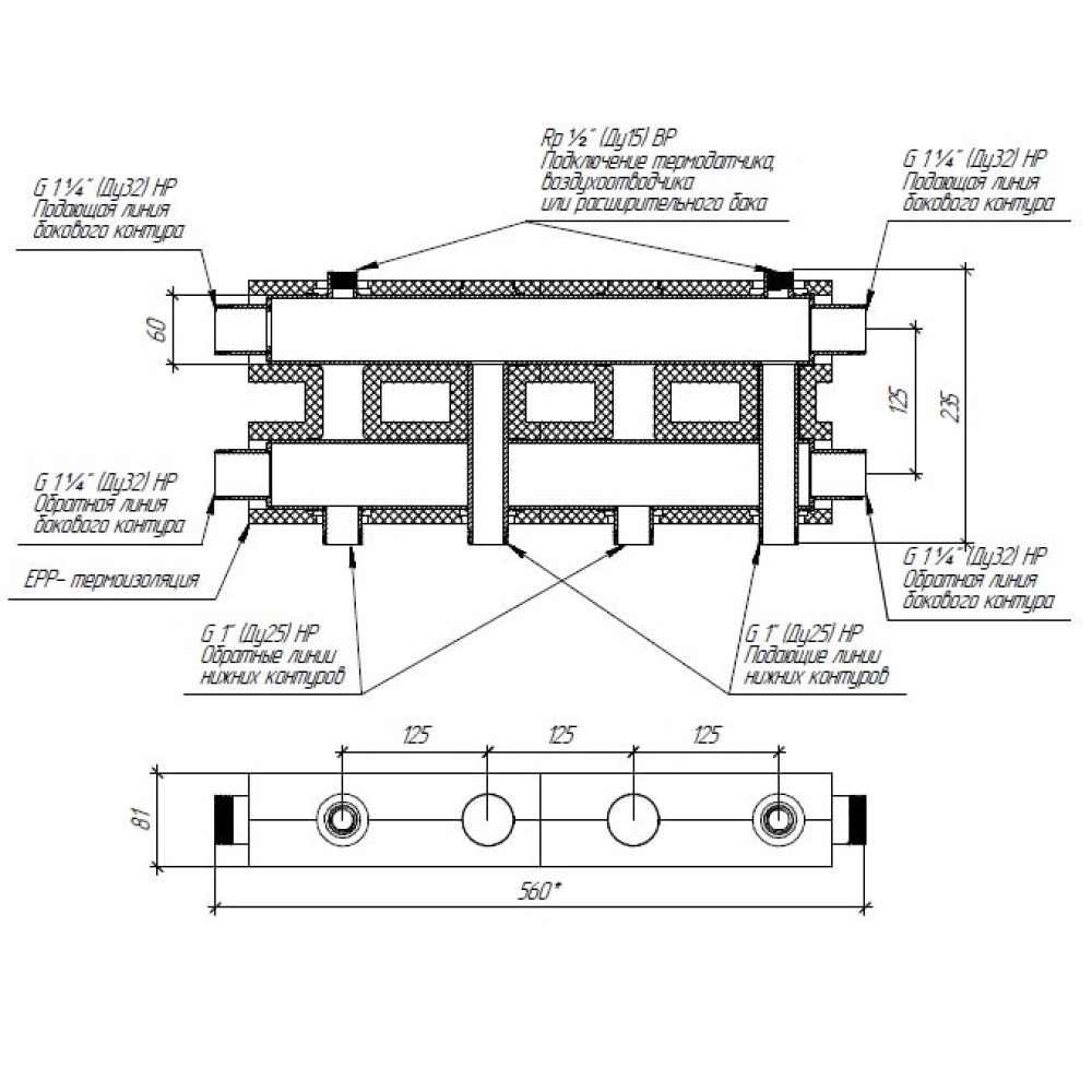 Модульный коллектор отопления с термоизоляцией предназначен для распределения и сбора теплоносителя по контурам-потребителям G 1″ и одному G ¼″, где подающая и обратная линия каждого контура расположены в одной плоскости с осевым расстоянием 125 мм.