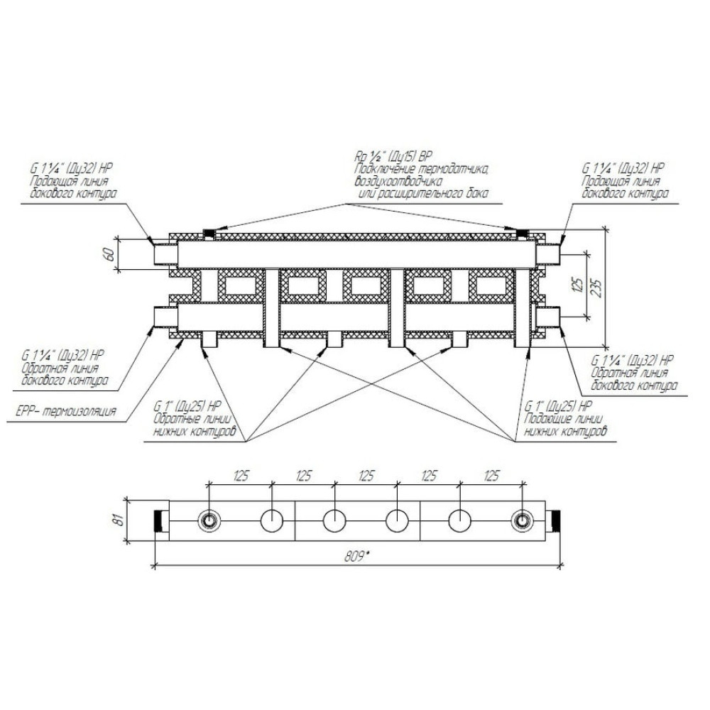 Модульный коллектор отопления с термоизоляцией предназначен для распределения и сбора теплоносителя по контурам-потребителям G 1″ и одному G ¼″, где подающая и обратная линия каждого контура расположены в одной плоскости с осевым расстоянием 125 мм.