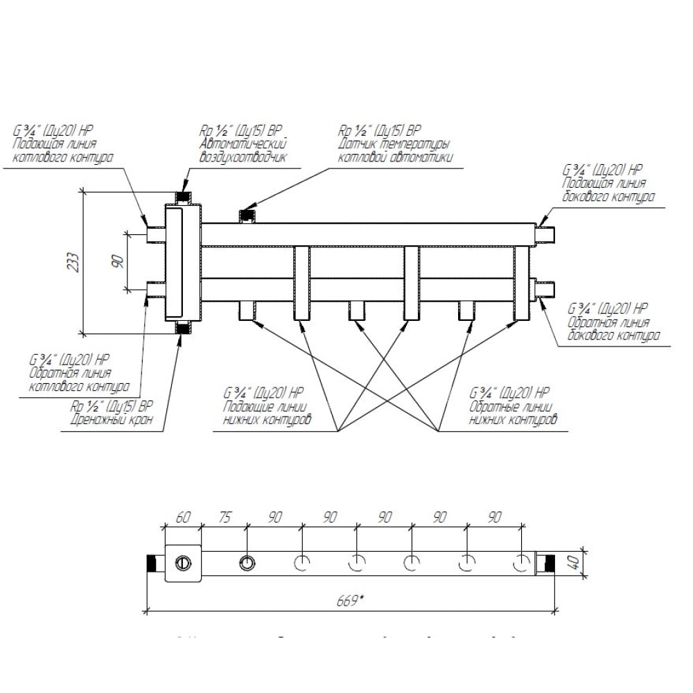 Гидрострелка на 3-4 контура BMSS-40-4D (балансировочный коллектор 3+1) предназначена для систем отопления на базе настенного газового или электрического котла.