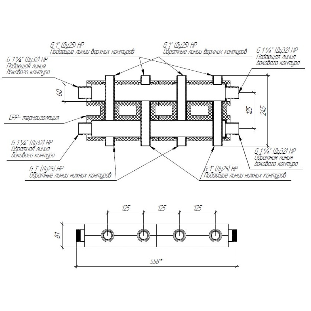 Коллектор нержавеющий модульный Gidruss MKSS-100-4DU до 100 кВт 1 1/4" 5 контуров