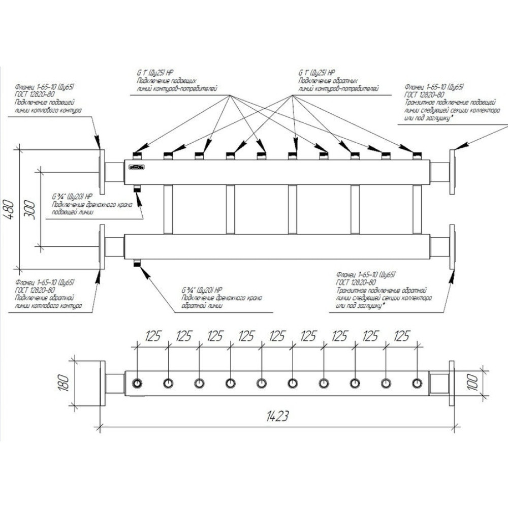 Коллектор фланцевый Ду65 предназначен для распределения теплоносителя по контурам или его сбора в каскад в котельных и ИТП до 400 кВт в условиях повышенной коррозии (жесткой воды, высокой влажности, наличием кислорода в системе из-за полипропиленовых труб).