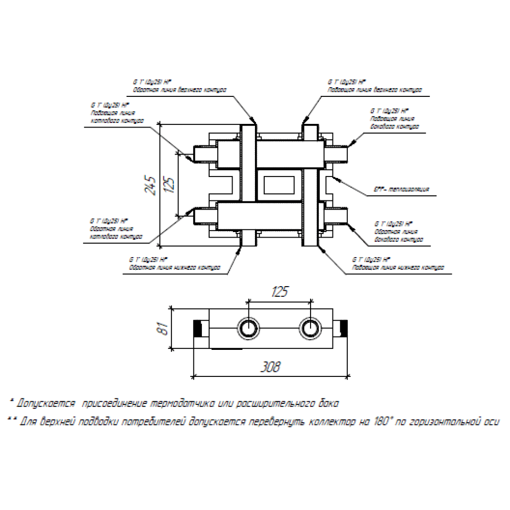 Коллектор предназначен для систем отопления с напольным котлом до 50 кВт без насоса (при условии отсутствия ограничения по количеству минимальной подачи) или для обвязки 1-2-х настенных котлов до 60 кВт. Теплоизоляция и кронштейны с регулировкой вылета в комплекте.