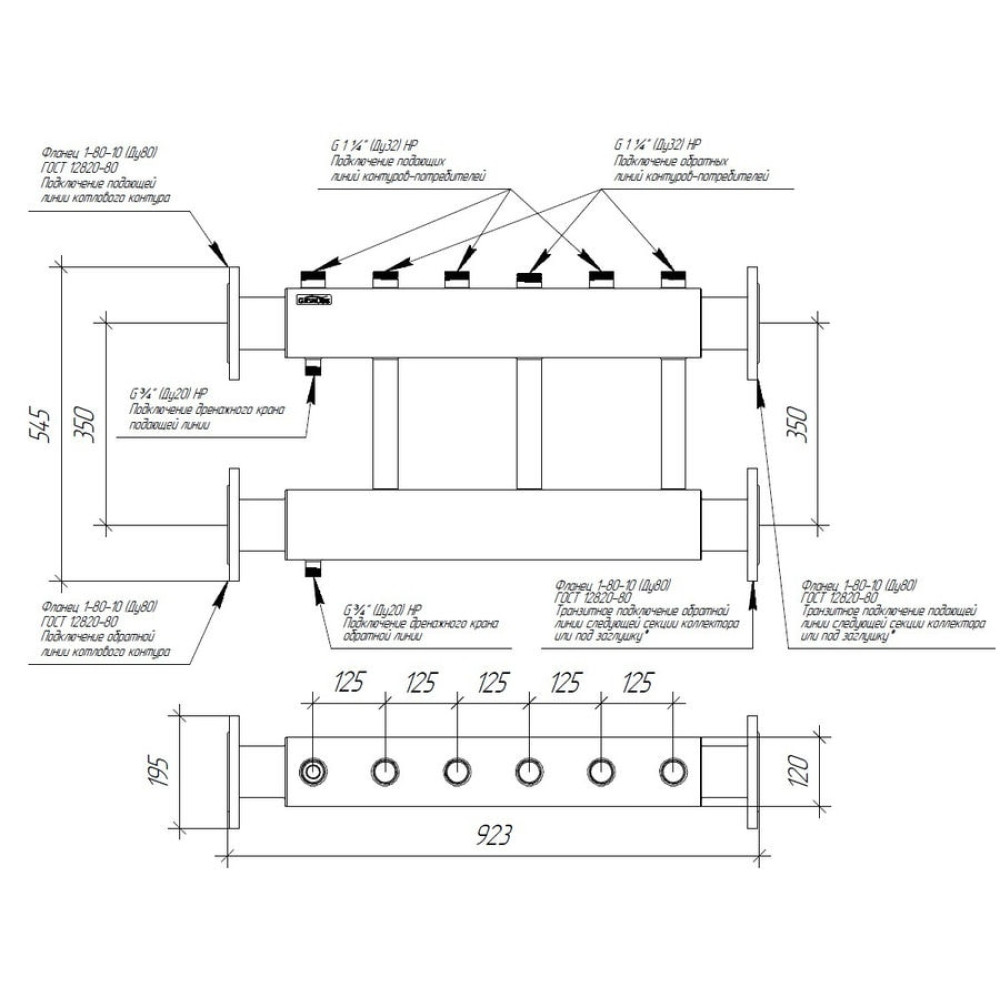 Коллектор фланцевый Ду80 предназначен для распределения теплоносителя по контурам или его сбора в каскад в котельных и ИТП до 600 кВт в условиях повышенной коррозии (жесткой воды, высокой влажности, наличием кислорода в системе из-за полипропиленовых труб).