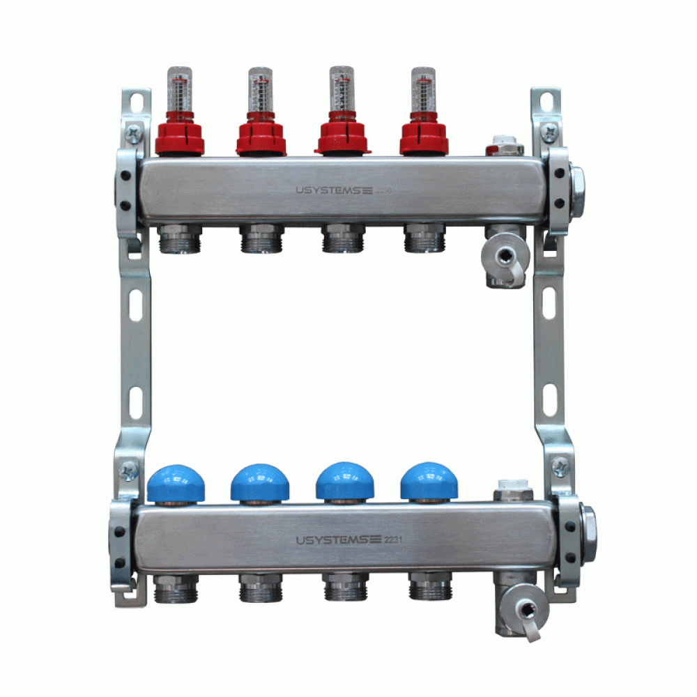 Подающий коллектор оснащен регулируемыми расходомерами из технополимера PPA со шкалой от 0 до 5 л/мин для балансировки расхода в каждой петле с возможностью полного закрытия петли.