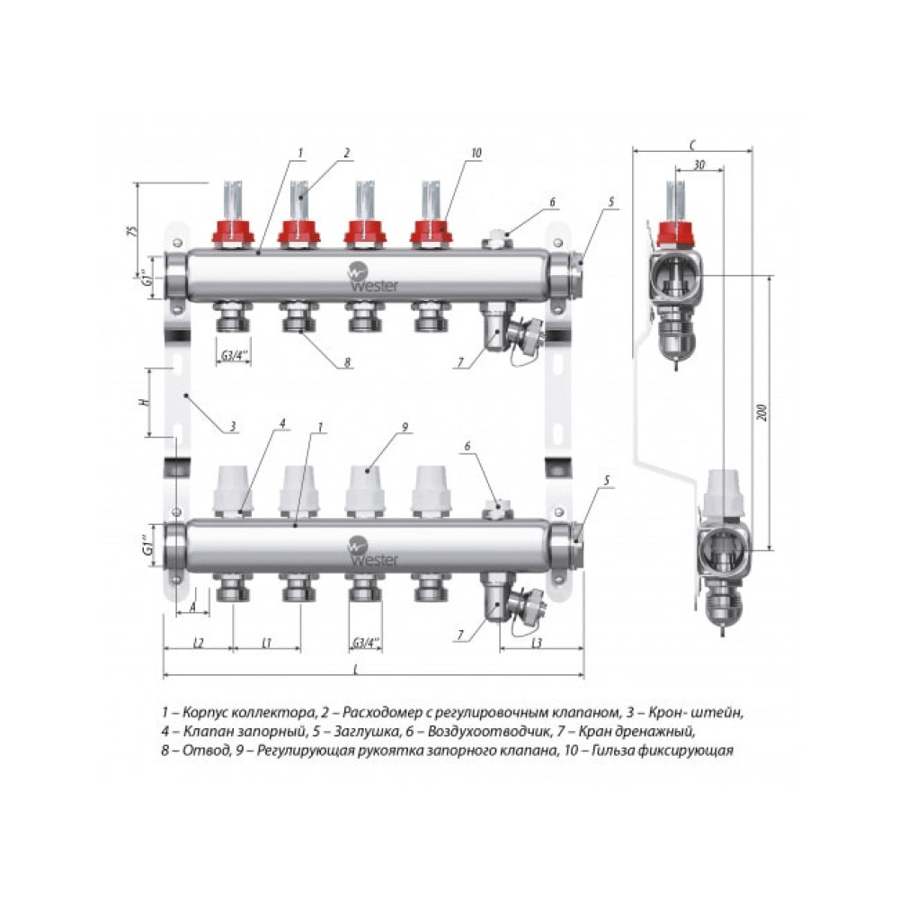 Коллекторы Wester W902 из нержавеющей стали с расходомерами и запорными клапанами предназначены для оптимизации и контроля распределения теплоносителя в системах радиаторного отопления и подогрева пола.