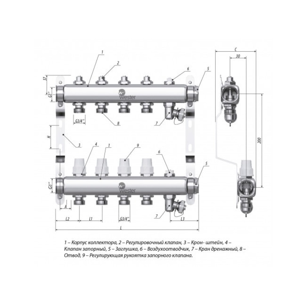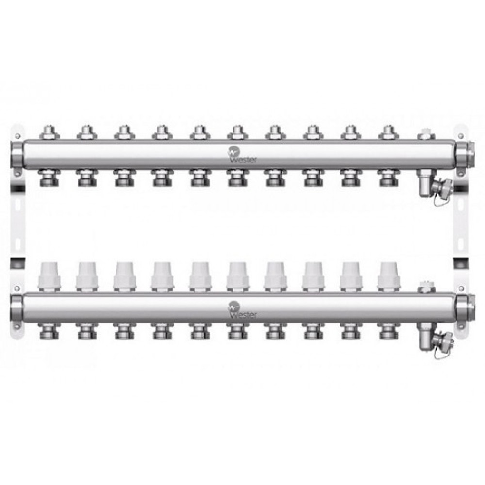 Коллекторы Wester W903 из нержавеющей стали с регулирующими вентилями и запорными клапанами предназначены для оптимизации и контроля распределения теплоносителя в системах радиаторного отопления и подогрева пола.