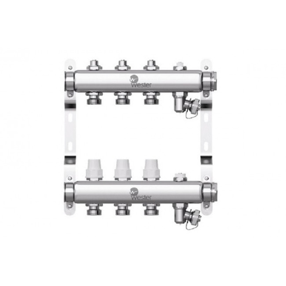Коллекторы Wester W903 из нержавеющей стали с регулирующими вентилями и запорными клапанами предназначены для оптимизации и контроля распределения теплоносителя в системах радиаторного отопления и подогрева пола.