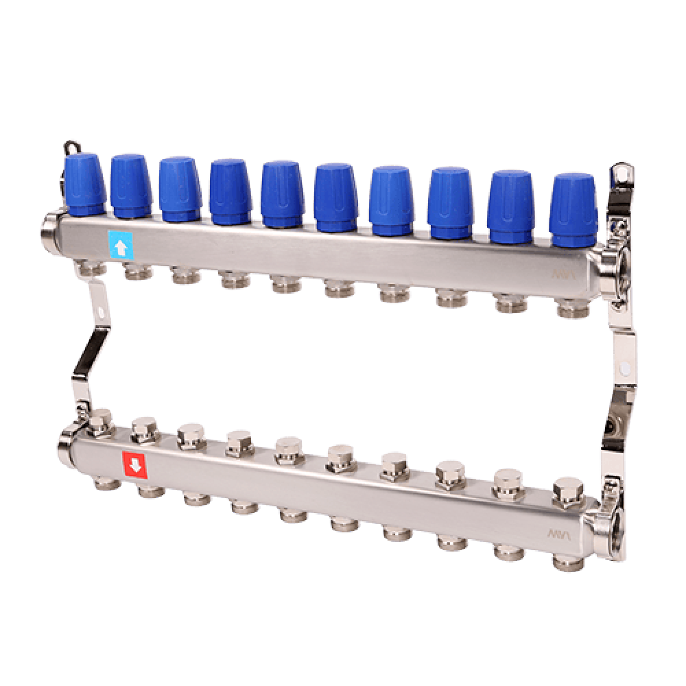 Коллекторные блоки MVI предназначены для распределения потока рабочей среды систем водяного отопления по потребителям. При этом под «потребителем» понимается отдельный нагревательный прибор или группа приборов, контур или петля «теплого пола», отдельные части или ветви системы. Коллекторный блок объединяет в себе подающий и обратный коллекторы из нержавеющей стали, запорные клапаны, термостатические клапаны (с возможностью установки электротермического сервопривода) и крепежные кронштейны. Коллекторные блоки могут работать как на водяном, так и низкозамерзающем (гликолевом) теплоносителе. Коллекторные блоки выпускаются с количеством выходов от 2 до 12. Присоединение циркуляционных петель осуществляется с помощью фитингов стандарта «евроконус» 3/4" (НР).