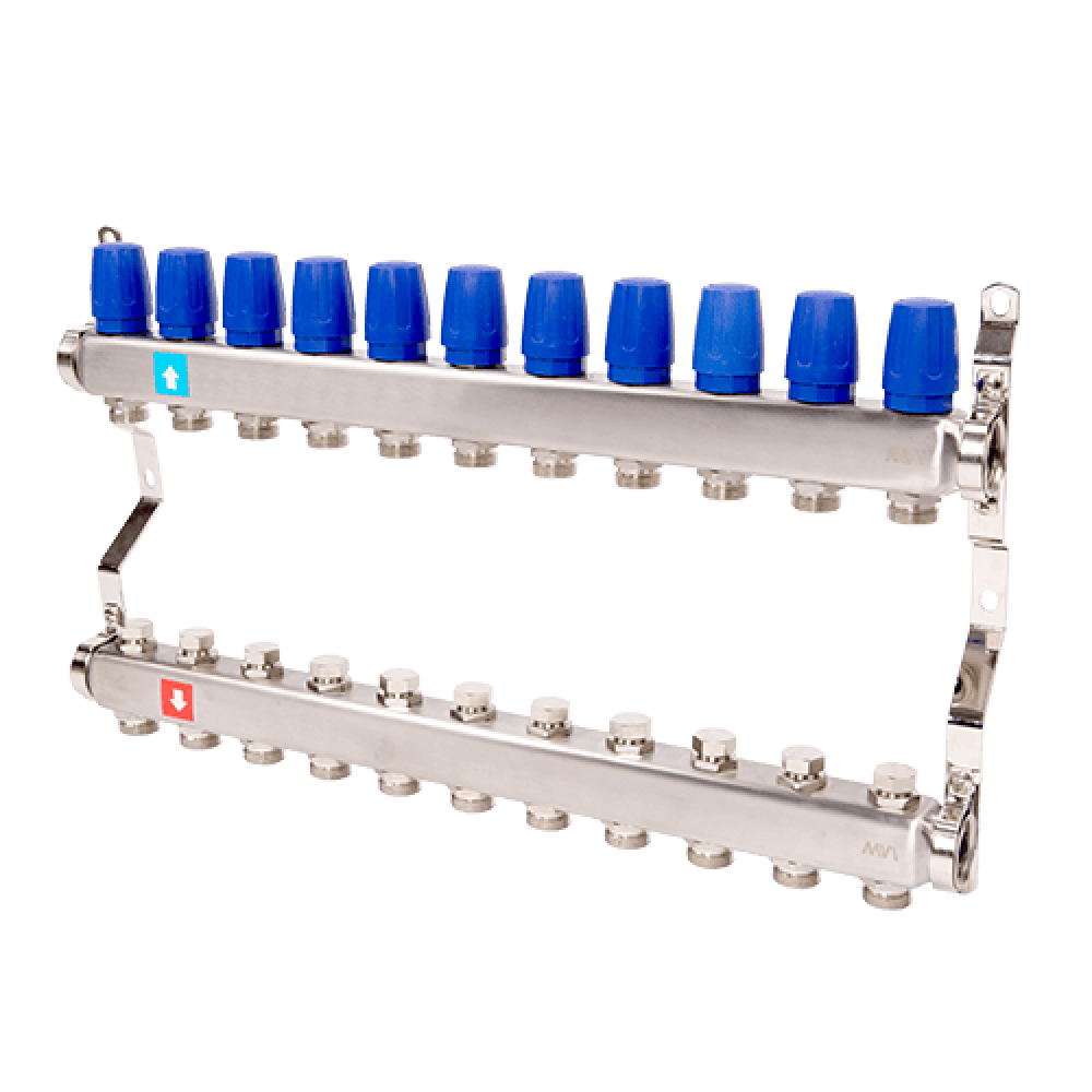 Коллекторные блоки MVI предназначены для распределения потока рабочей среды систем водяного отопления по потребителям. При этом под «потребителем» понимается отдельный нагревательный прибор или группа приборов, контур или петля «теплого пола», отдельные части или ветви системы. Коллекторный блок объединяет в себе подающий и обратный коллекторы из нержавеющей стали, запорные клапаны, термостатические клапаны (с возможностью установки электротермического сервопривода) и крепежные кронштейны. Коллекторные блоки могут работать как на водяном, так и низкозамерзающем (гликолевом) теплоносителе. Коллекторные блоки выпускаются с количеством выходов от 2 до 12. Присоединение циркуляционных петель осуществляется с помощью фитингов стандарта «евроконус» 3/4" (НР).