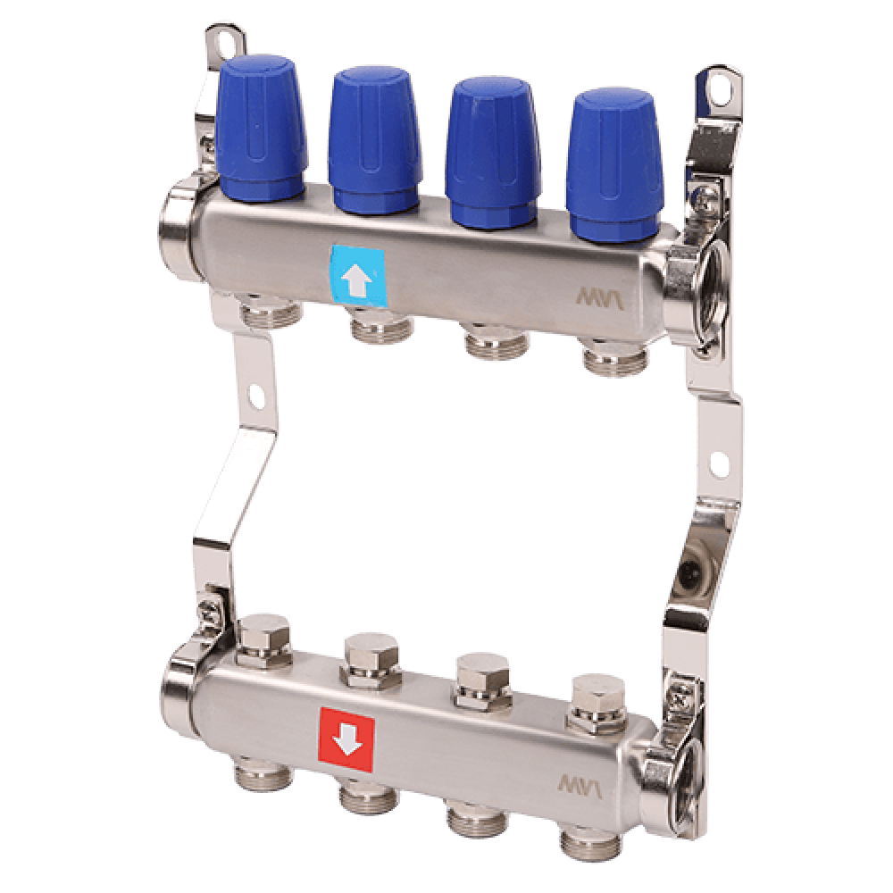 Коллекторные блоки MVI предназначены для распределения потока рабочей среды систем водяного отопления по потребителям. При этом под «потребителем» понимается отдельный нагревательный прибор или группа приборов, контур или петля «теплого пола», отдельные части или ветви системы. Коллекторный блок объединяет в себе подающий и обратный коллекторы из нержавеющей стали, запорные клапаны, термостатические клапаны (с возможностью установки электротермического сервопривода) и крепежные кронштейны. Коллекторные блоки могут работать как на водяном, так и низкозамерзающем (гликолевом) теплоносителе. Коллекторные блоки выпускаются с количеством выходов от 2 до 12. Присоединение циркуляционных петель осуществляется с помощью фитингов стандарта «евроконус» 3/4" (НР).