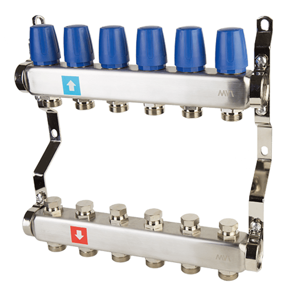 Коллекторные блоки MVI предназначены для распределения потока рабочей среды систем водяного отопления по потребителям. При этом под «потребителем» понимается отдельный нагревательный прибор или группа приборов, контур или петля «теплого пола», отдельные части или ветви системы. Коллекторный блок объединяет в себе подающий и обратный коллекторы из нержавеющей стали, запорные клапаны, термостатические клапаны (с возможностью установки электротермического сервопривода) и крепежные кронштейны. Коллекторные блоки могут работать как на водяном, так и низкозамерзающем (гликолевом) теплоносителе. Коллекторные блоки выпускаются с количеством выходов от 2 до 12. Присоединение циркуляционных петель осуществляется с помощью фитингов стандарта «евроконус» 3/4" (НР).