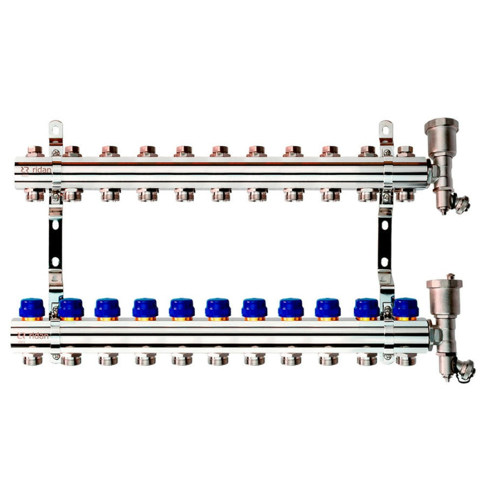 Распределитель включает в себя подающий и обратный коллекторы. В комплект входят две концевые секции с автоматическими воздухоотводчиками и кронштейнами. Подающий коллектор может отключать каждый контур системы и может быть оснащен ротаметрами (серия FHF-RF). Обратный коллектор оснащен встроенными клапанами с предварительной настройкой пропускной способности, обеспечивая оптимальную гидравлическую балансировку системы.
