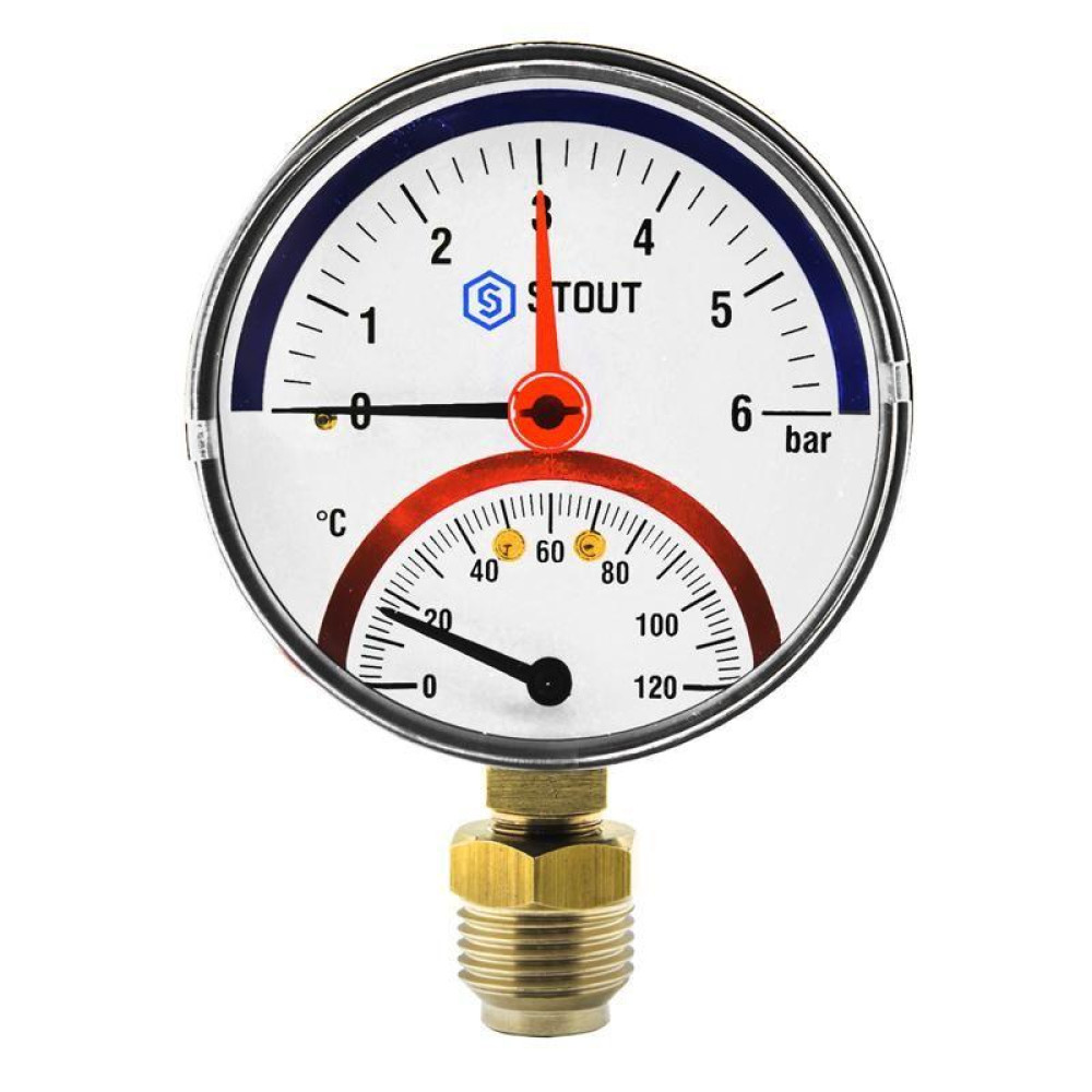 Термоманометр радиальный (корпус Dn 80 мм, шкала 0-6 бар, 0-120°С, 1/2") с автоматическим запорным клапаном Stout