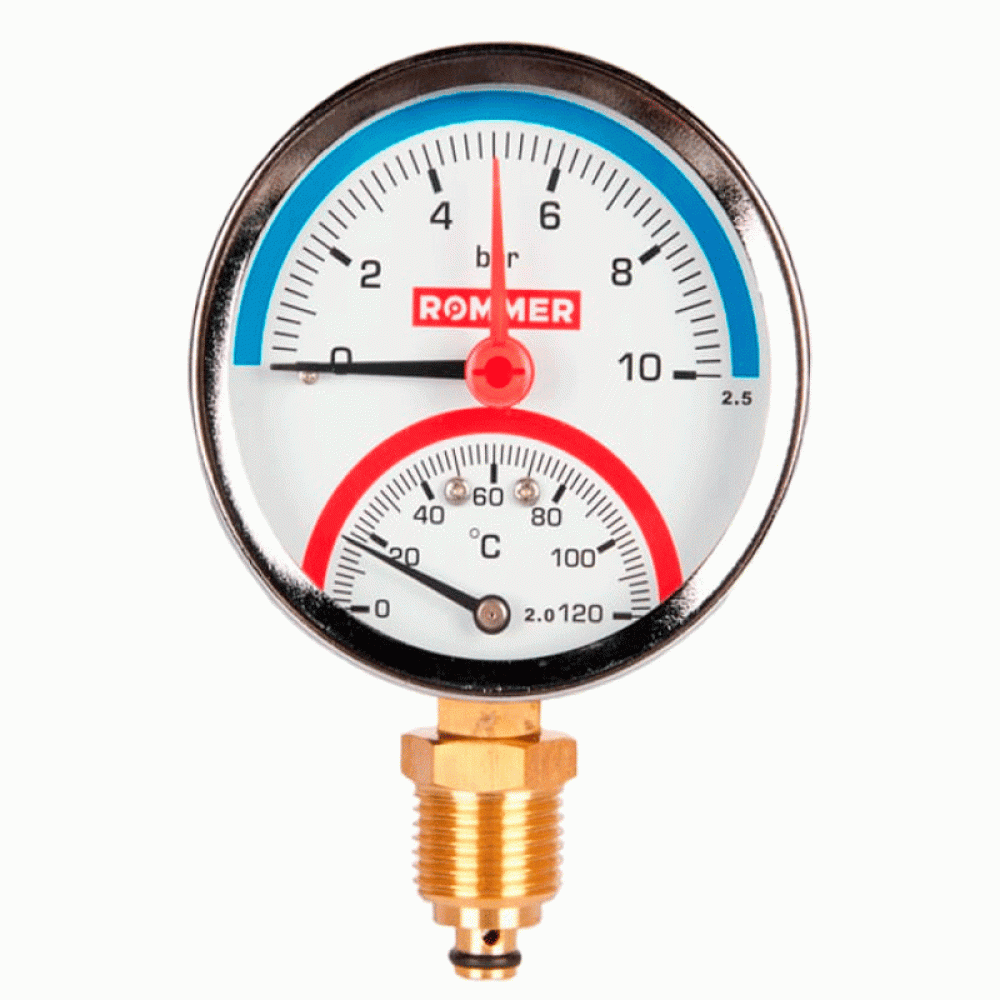 Стрелочные показывающие термоманометры с биметаллическим термочувствительным датчиком, аксиальные и радиальные Rommer – предназначены для мониторинга давления и температуры сред в системах отопления, горячего и холодного водоснабжения, тепло- и холодоснабжения вентиляционных установок.