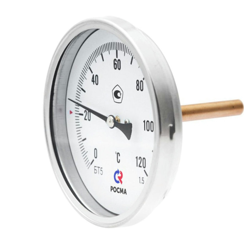 Тип БТ, серия 211. Термометр биметаллический (осевое присоединение) в комплекте с защитной латунной* погружной гильзой. Прибор предназначен для измерения температуры жидкостей, пара и газов в отопительных и санитарных установках, в системах кондиционирования и вентиляции. Принцип действия прибора основан на зависимости деформации чувствительного элемента от измеряемой температуры. В качестве чувствительного элемента используется биметаллическая пружина. Она изготавливается из двух прочно соединенных металлических пластин, имеющих различные температурные коэффициенты линейного расширения. При изменении температуры пружина изгибается и вращает стрелку термометра. Один её конец закреплен внутри штока, а к другому присоединяется ось стрелки. Корпус прибора изготавливается из коррозионностойкой стали, шток — из нержавеющей стали.