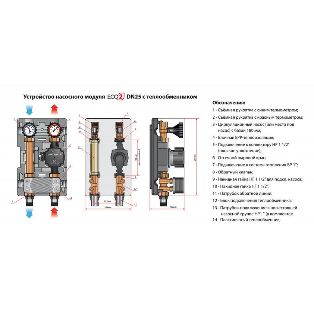 Насосные модули ECO 2 DN25 (1") со встроенным разделительным теплообменником образуют разделительный прямой контур на основе встроенного меднопаянного теплообменника из нержавеющей стали. Модули могут устанавливаться сверху насосных групп МK или DK типоразмера DN25. Модули позволяют подключать к системе отопления контур с антифризом, или с водой, в которой находится растворённый кислород из атмосферы.