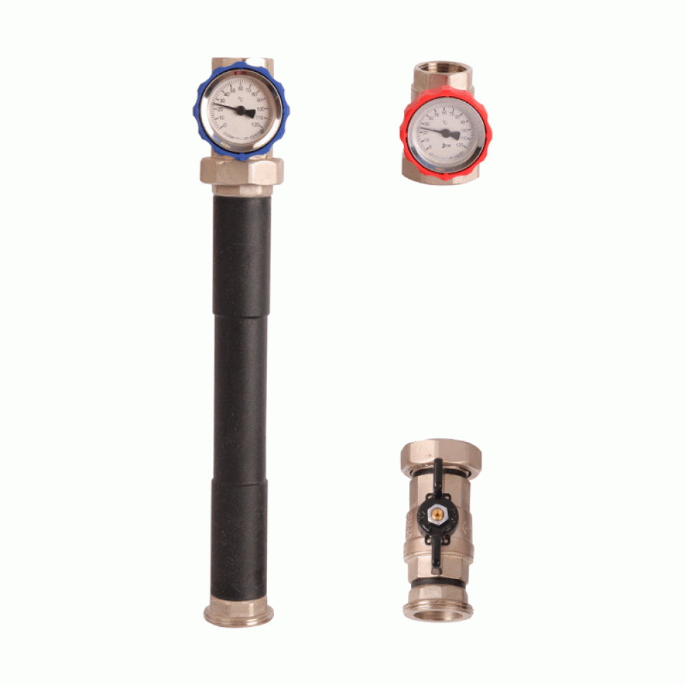 Шаровые краны с термометром на обратной и подающей линиях (синий/красный) с накидной гайкой 1 1/2;