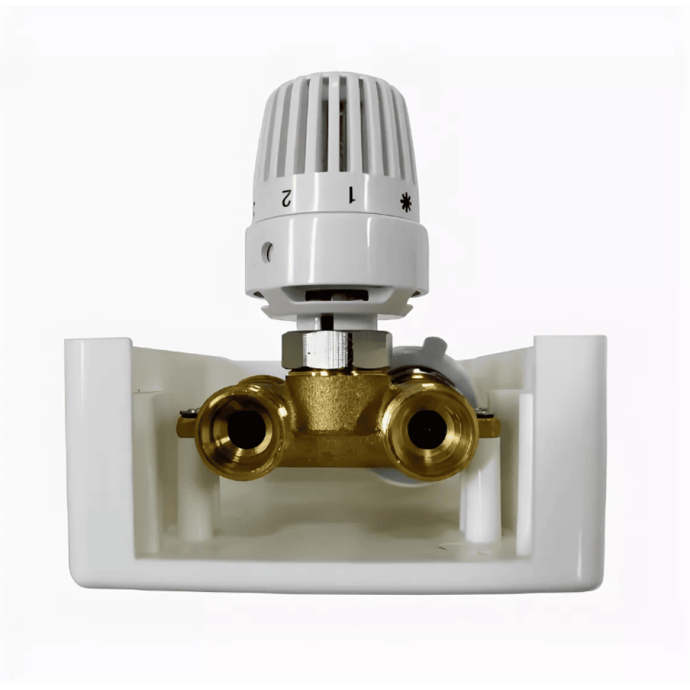 Регулировочный короб TIM TCB-K/RTL 01 с термостатическим клапаном и ограничителем обратного потока с помощью вентиля UNI-RTL. Используется для подключения одного отопительного контура площадью до 20 м2.