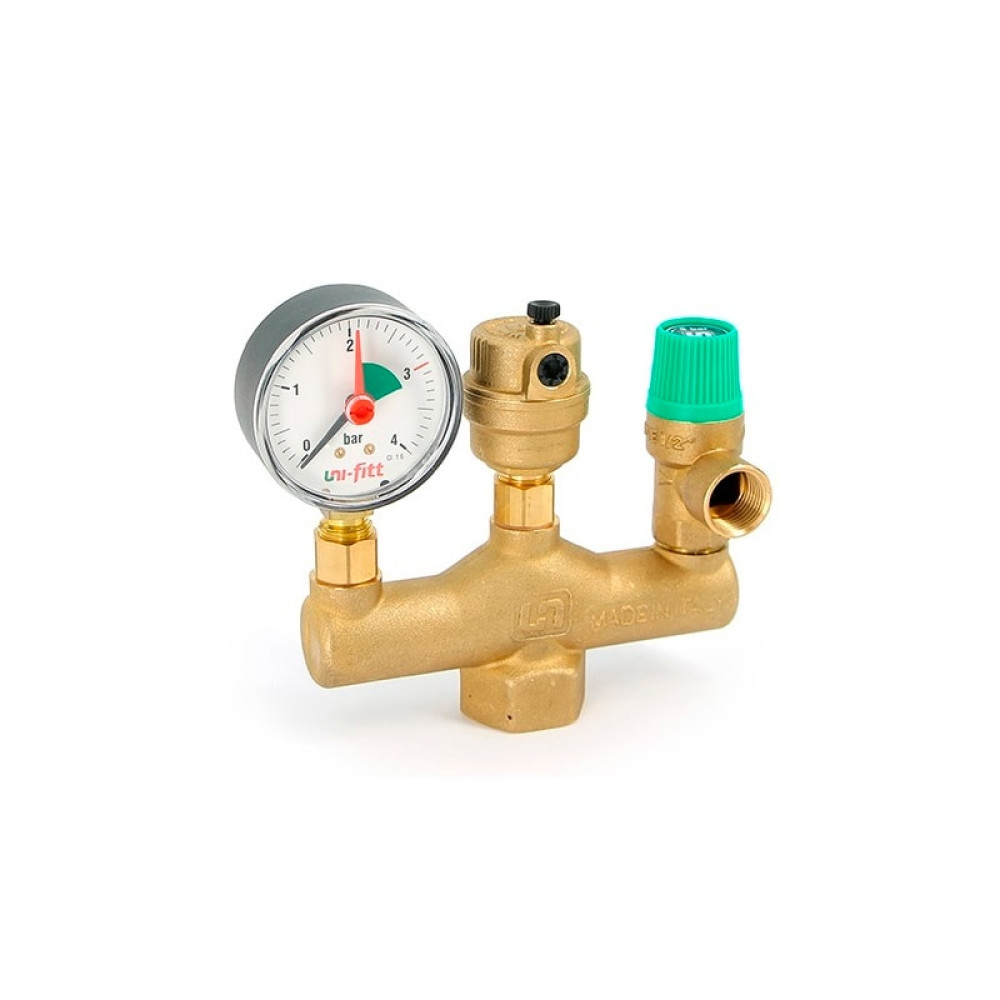 Группа безопасности котла Uni-Fitt 252G4530 из латуни (до 50 кВт, 1", 3 бар) используется для защиты бытовых систем отопления (отопительных котлов мощностью до 50 кВт) от превышения давления, отображения давления в системе и удаления воздуха из неё .
