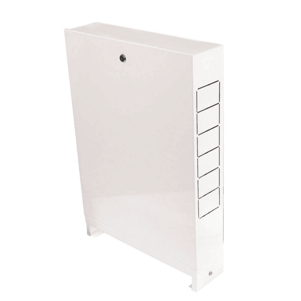 Шкафы коллекторные ROMMER ШРН наружные представляют собой специализированные металлические шкафы, предназначенные для размещения распределительных коллекторов радиаторной или напольной разводки, а также водопровода. Они изготавливаются из листовой стали, окрашенной порошковой эмалью белого цвета RAL 9016, что обеспечивает их долговечность и эстетичный внешний вид.
