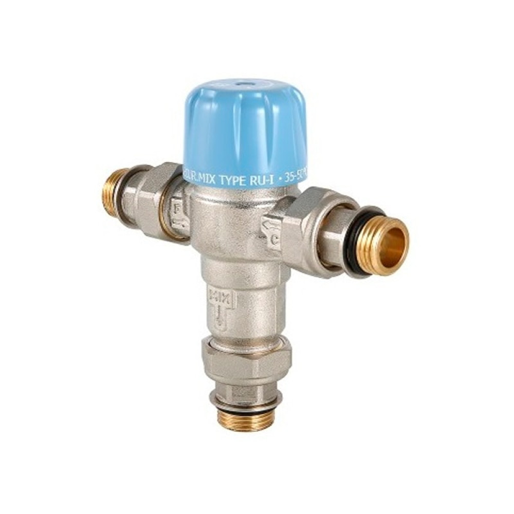 Клапан выполнен из качественной латуни марки CW617N, никелирован. Встроенный термочувствительный элемент жидкостного типа наполнен толуолом. Патрубки клапана соединены накидными гайками с полусгонами. Резьба присоединений – внешняя. Входы смесителя комплектуются обратными клапанами из нейлона.