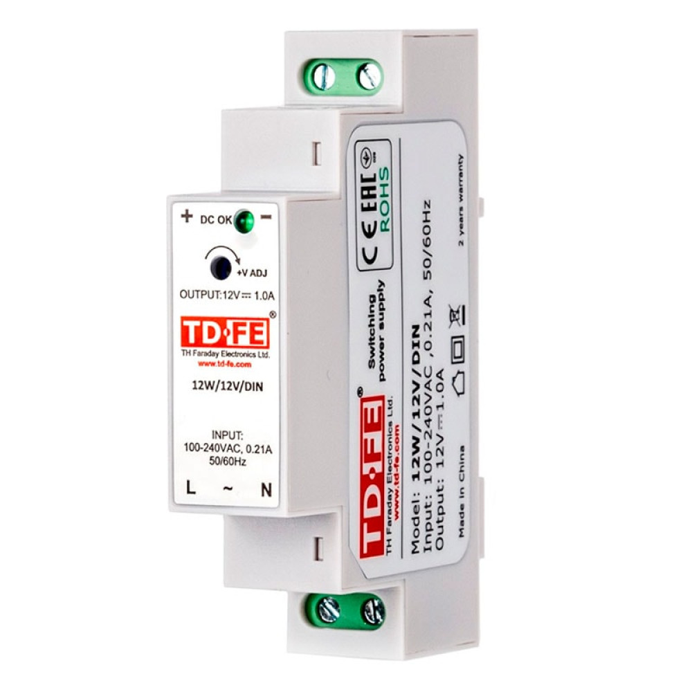 Блок питания FARADAY 12W/12V/DIN - источник электропитания стабилизированный импульсный для установки на DIN-рейку, номинальное выходное напряжение 12 В.