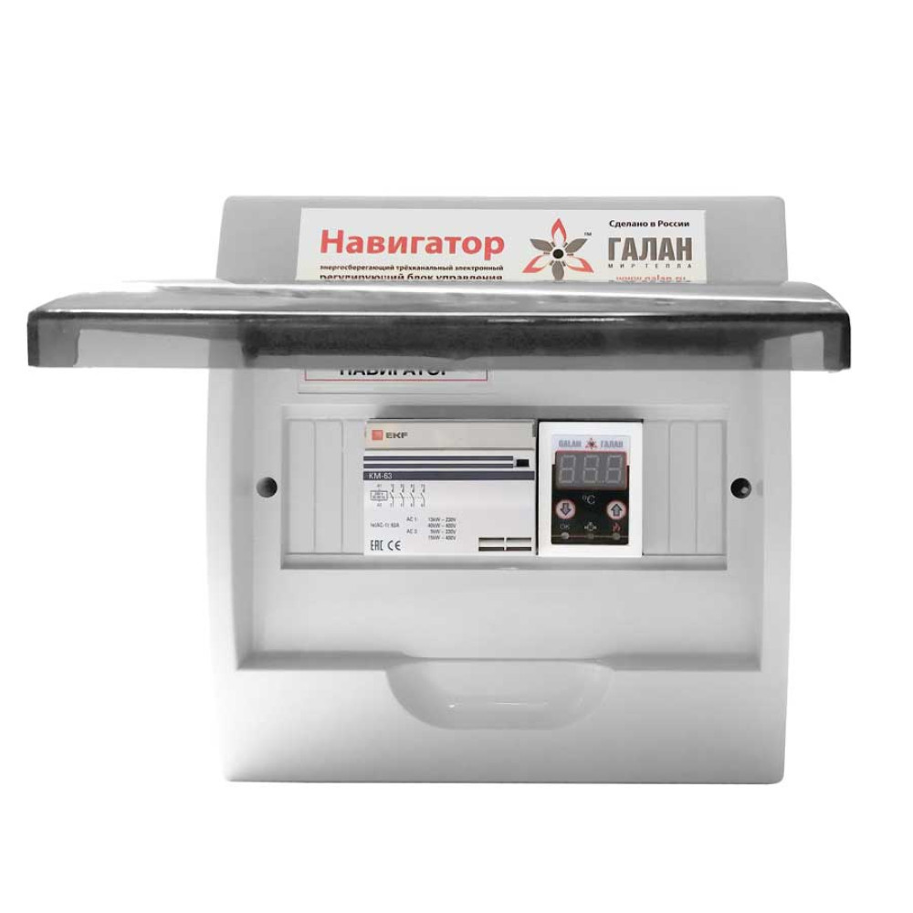 Цифровой регулятор температуры Галан Навигатор Базовый состоит из корпуса, электронного блока с подсоединенными датчиками температуры (красный — подающей трубы и синий обратной трубы); индикаторов работы ступеней нагрева; индикатора включения циркуляционного насоса; индикатора включения внешнего регулятора комнатной температуры; индикаторов канала обратки (синий) и подачи (красный); индикатора температуры; ручки управления; выключателя; переходной колодки подключения циркуляционного насоса и подачи питания блока управления 220 В; реле-контактора (в варианте исполнения Н2 два контактора, 4 в варианте исполнения Н3 — три контактора); контроллера тока 12 (для варианта НКТ); нулевой шины.