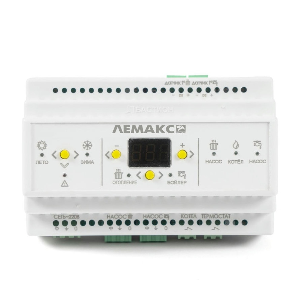 Термоконтроллер предназначен для управления системой контуров водяного отопления и ГВС, построенной по схеме, состоящей из котла и двух циркуляционных насосов. Контроллер обеспечивает поддержание заданной пользователем температуры теплоносителя и бойлера по данным термодатчиков, а так же управление питания насосов рециркуляции отопления, бойлера (ГВС – горячее водоснабжение), раздельную корректировку значения температуры для контуров отопления и бойлера. Контроллер показывает индикацию режимов работы изделия посредством светодиодных индикаторов, индикацию значений текущей температуры каждого контура и заданных параметров посредством цифрового дисплея. Количество подключаемых котлов – 1. Количество подключаемых насосов — 2. Максимальный коммутируемый ток реле котла – 3 А. Максимальный ток выходов насосов – 3А.