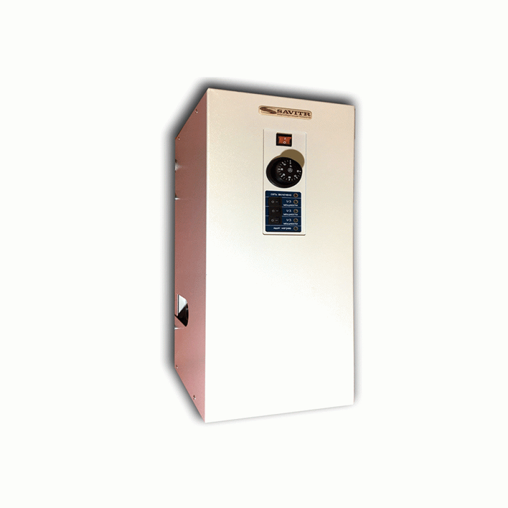 Savitr Monoblock одна из самых популярных и недорогих моделей. Используется для отопления. Площадь отопления от 50 до 240 кв.м.. Силовая схема построена на слаботочных реле. На лицевой панели электро котла Savitr Monoblock установлены элементы управления: автоматический выключатель включения котла и нулевой клеммы, переключатель по ступеням (прибор имеет три ступени мощности) и регулятор температуры теплоносителя в диапазоне 0-90 °С. Электропитание осуществляется от однофазной сети переменного тока напряжением 220 В (для моделей 6, 7 и 9 кВт) и 380 Вольт (для моделей от 6 до 22.5 кВт). Базовая комплектация включает в себя датчик температуры воздуха итальянского производства, устанавливаемый в отапливаемом помещении и позволяющий регулировать температуру воздуха не используя панель управления котлом.