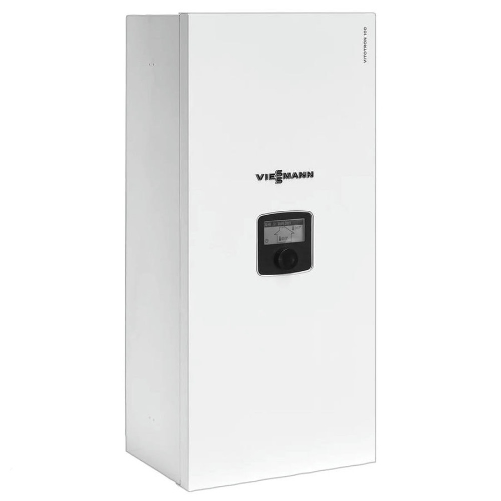 Электрокотел с модуляцией мощности Viessmann Vitotron 100 VMN3 24 и погодозависимой автоматикой на 24 кВт. Новинка от компании Viessmann. Отличительной особенностью данного устройства является плавное управление мощностью для поддержания оптимального режима работы и избегания пиковых нагрузок. Благодоря встроенному симистру и схеме подключения нагревательных элементов минимальная мощность котла 24 кВт составляет всего 1.3 кВт. Система переключения ТЭНОВ работает абсолютно бесшумно. Так же в котле присутствует функция ГВС за счет подключения внешнего трехходового клапана. Наличие в котле насоса системы отопления и расширительного бака с предохранительной арматурой по праву