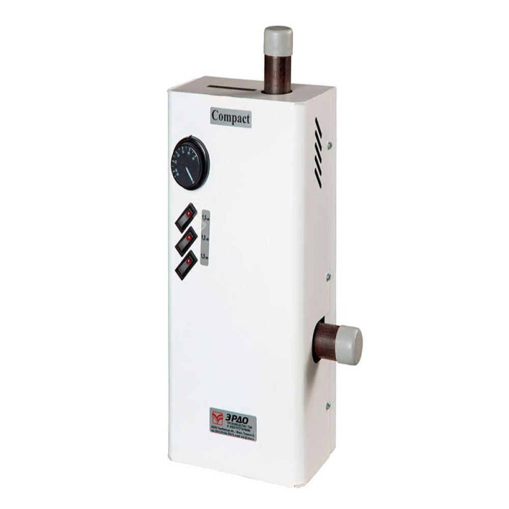 Оснащен встроенным механическим пультом управления для регулирования и поддержания температуры нагрева теплоносителя. Патрубки, предназначенные для присоединения электрокотла к системе отопления, в котлах Compact изготавливаются в одном варианте – они перпендикулярны друг-другу (патрубок на подачу – вертикальный, «обратка» – горизонтальный). Для защиты от перегрева котел оборудован аварийным термостатом с механическим возвратом, расположенным в верхней части колбы. Корпус прибора с вертикальными ребрами жесткости.
