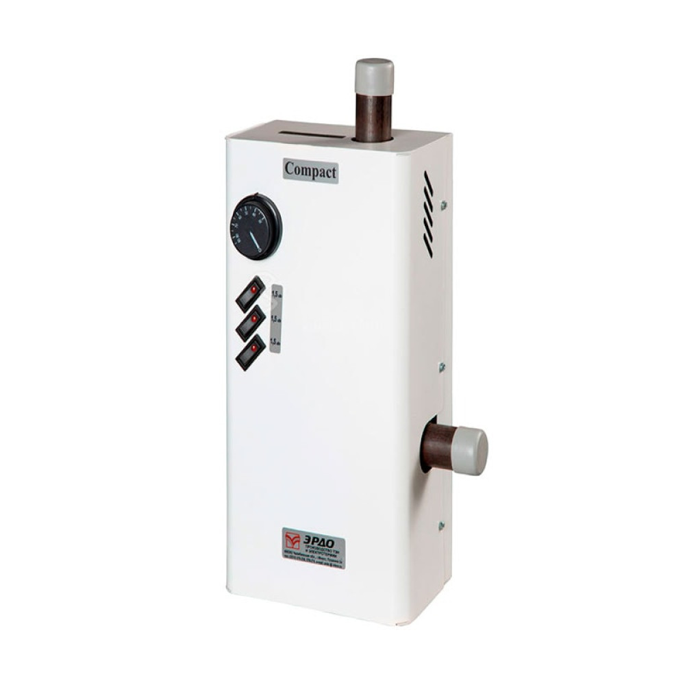 Оснащен встроенным механическим пультом управления для регулирования и поддержания температуры нагрева теплоносителя. Патрубки, предназначенные для присоединения электрокотла к системе отопления, в котлах Compact изготавливаются в одном варианте – они перпендикулярны друг-другу (патрубок на подачу – вертикальный, «обратка» – горизонтальный). Для защиты от перегрева котел оборудован аварийным термостатом с механическим возвратом, расположенным в верхней части колбы. Корпус прибора с вертикальными ребрами жесткости.
