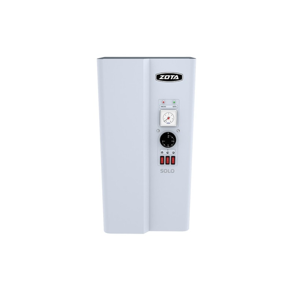 ZOTA Solo - электрокотел с циркуляционным насосом, трехступенчатой регулировкой мощности, и установленной группой безопасности котла. Модуля GSM управления конструкцией не предусмотрен, но его можно подключить опционально. Погодозависимой автоматики нет. Стоит отметить, что ТЭНовая группа точно такая же, нержавеющая, низкотемпературная, как и в премиальных электрокотлах Zota.
