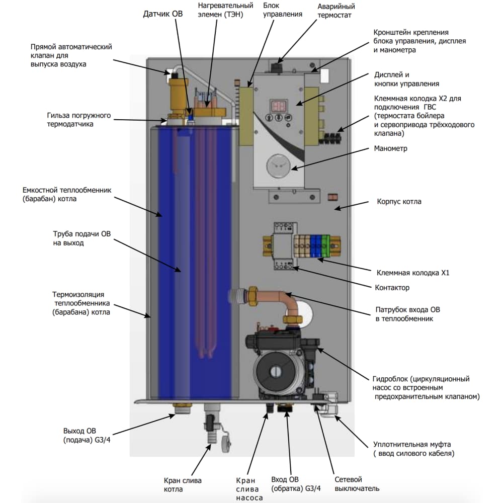 Нагрев отопительной воды происходит в емкостном теплообменнике (барабане) котла двумя нагревательными элементами (ТЭНами). Нагревательный элемент содержит три нагревательных стержня. Процесс нагрева контролируется блоком управления с функцией безошибочной плавной электронной регулировкой температуры (PI регулировкой), что обеспечивает экономичную эксплуатацию котла и всей отопительной системы.
