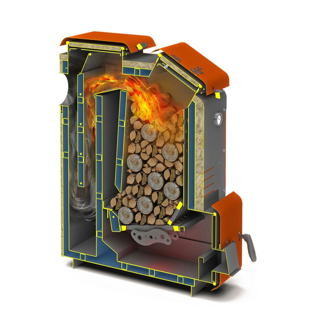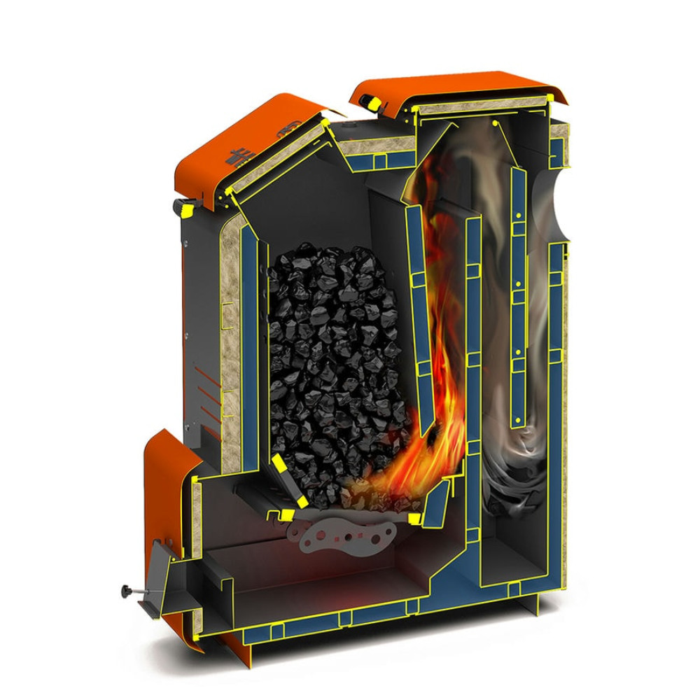 Главной особенностью котла является большая наклонная загрузочная дверца благодаря чему, закладка дров происходит невероятно просто и удобно. В режиме горения котел способен работать до 36 часов на угле. После прогорания основного вида топлива можно использовать нагревательный элемент ТЭН (не входит в комплектацию).