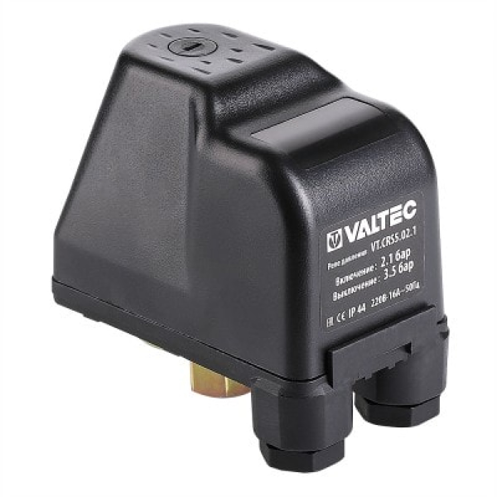 Реле давления VT.CRS5.02.1 – коммутационное устройство, предназначенное для автоматизации работы электронасосов водоснабжения. Реле включает и выключает насос при занижении и превышении заданных значений минимального и максимального давления. Заводская настройка – 2,1/3,5 бара. Пользователь может изменить ее по своему усмотрению в диапазоне 1,0–5,3 бара (минимальная разница значений – 1,0 бара).