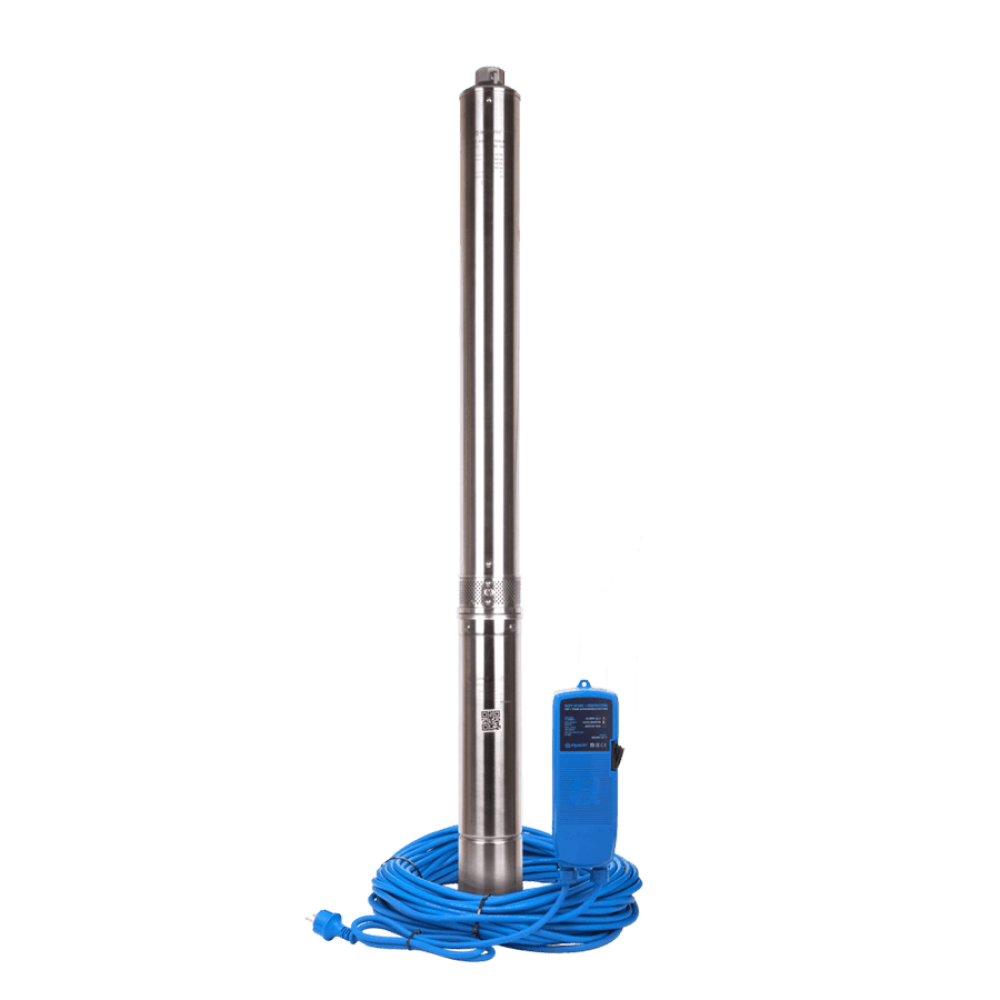 комплектация внешним защитным блоком с функцией плавного пуска, защиты от перегрузки двигателя, защиты от низкого и высокого напряжения в сети