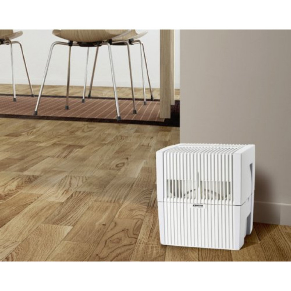 Вся бытовая группа аппаратов Venta рассчитана на определенный объем помещения. Экспериментальным путем для каждой модели была просчитана площадь барабанов, с которой воздух поглощает влагу, а также поверхность "зеркала" воды. Мойка воздуха Venta забирает сухой воздух из помещения, пропускает его через смоченные водой пластинчатые барабаны, на поверхности которых воздух набирает необходимую ему влажность, и возвращает обратно в помещение путем холодного испарения (т.е. незаметно). Переувлажнение и поступление извести в воздух помещения исключены, поэтому гигростат и цифровой дисплей не нужны.