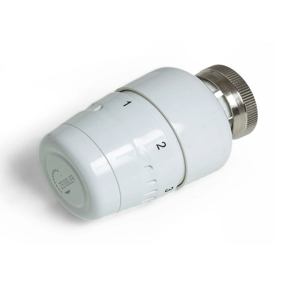 Термостатическая головка Tim белого цвета. Тип термочувствительного элемента: жидкостная камера с внутренним сильфоном. Подходит для термостатических вентилей и стальных радиаторов с резьбой M30 x 1.5.