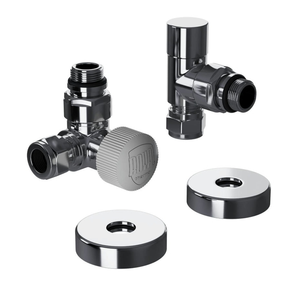 Термостатические наборы серии Design Pro поставляется в необходимой для чистового монтажа комплектации: клапан термостатический для установки на подающий трубопровод, запорный клапан для установки на обратный трубопровод, 2 гайки-фитинга для подключения клапанов к монтажной трубке 15 мм и 2 цельных латунных отражателя с внутренним резиновым уплотнением внутренним диаметром 15,2 мм.